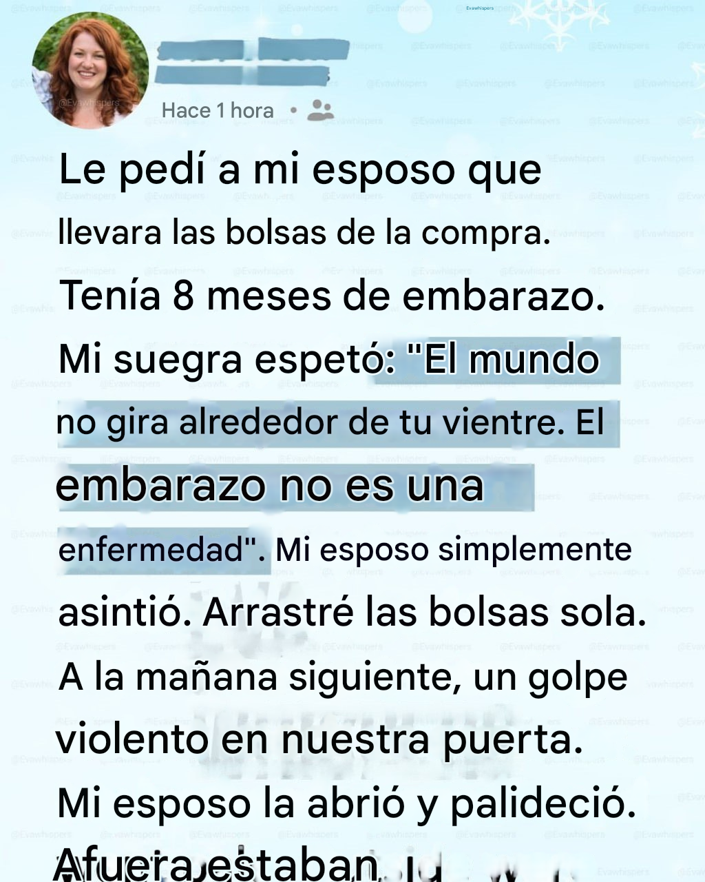 Me quedé allí, atónita. Las bolsas se sentían más pesadas en mis manos. Esperé, instintivamente, a que mi esposo interviniera. Que dijera algo. Que reconociera que lo que ella había dicho era cruel, o al menos innecesario.