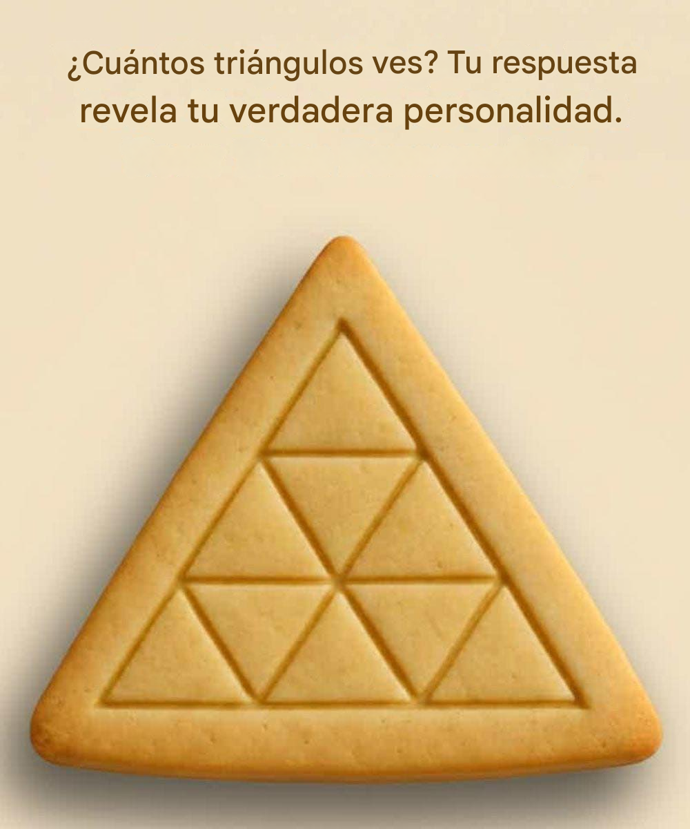 A nuestros cerebros les encantan los atajos. Cuando vemos una forma familiar como un triángulo, tendemos a centrarnos en las formas más obvias e ignoramos las combinaciones que se esconden a simple vista. Esta imagen juega con ese instinto al superponer triángulos dentro de triángulos: algunos apuntando hacia arriba, otros hacia abajo, algunos superpuestos y otros que se forman solo al combinar formas más pequeñas.