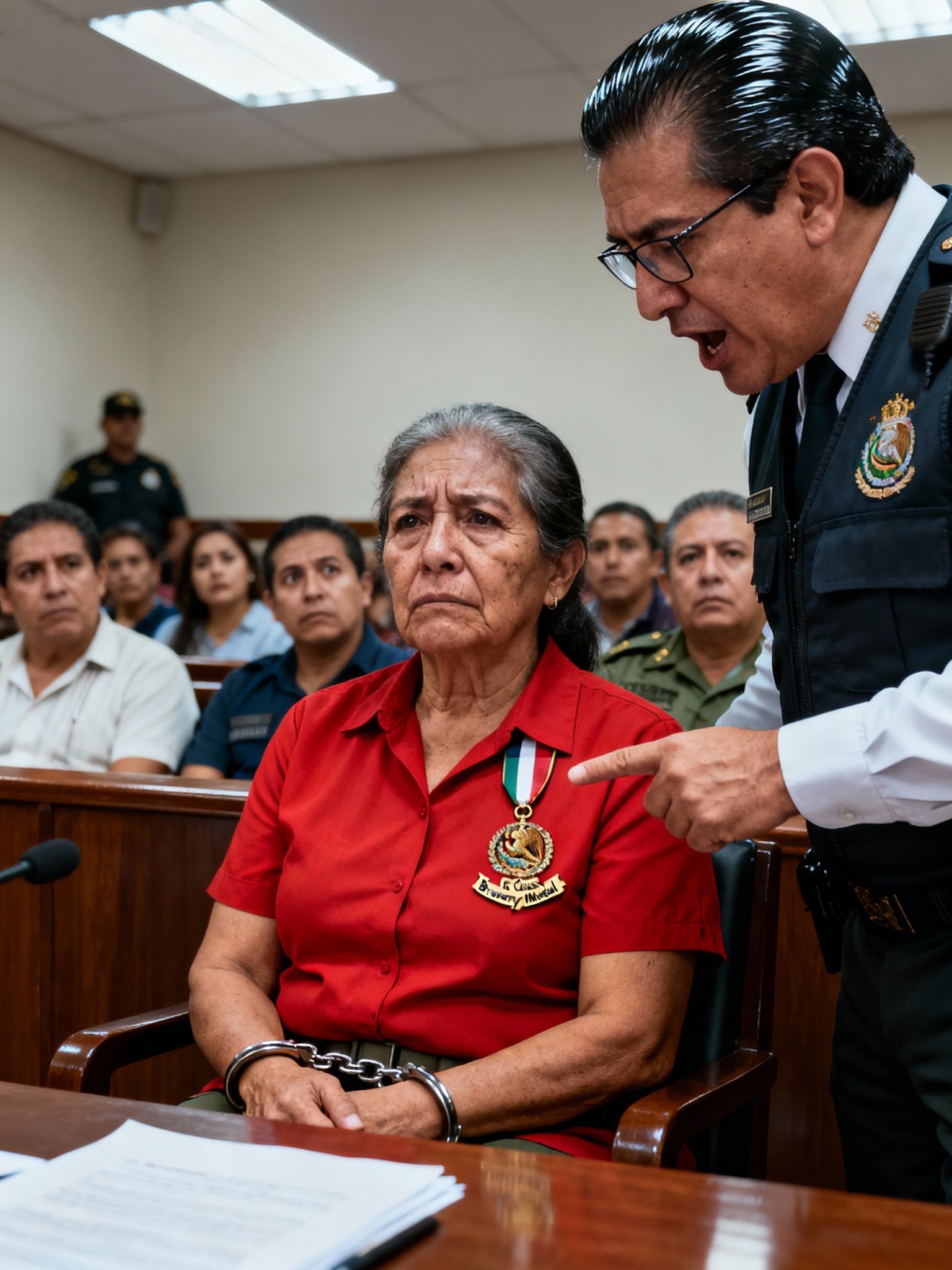La Sala 4 del Juzgado Cívico de Guadalajara estaba cargada de un aire espeso, mezclado con el zumbido cansado del aire acondicionado, el olor a café viejo y esa burocracia que se pega a la piel. En la tercera fila, sentada con la espalda recta como si aún estuviera en formación, estaba Elena Andrade, cincuenta y ocho años, ex Maestre de Sanidad Naval. Vestía una blusa roja sencilla y, sobre el pecho, llevaba la Condecoración al Valor Heroico de Primera Clase: una cinta azul cielo con trece estrellas bordadas y una estrella dorada al centro, abrazada por un ancla y laureles. No brillaba por vanidad, brillaba por memoria.