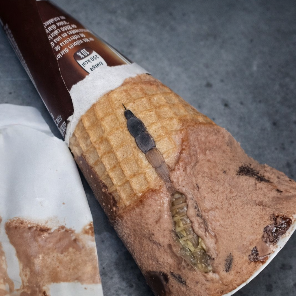 Hoy, mi hija abrió su helado de chocolate favorito, el mismo que come casi todos los días después de la escuela. Todo estaba como siempre: un cono crujiente, un aroma dulce, una suave capa de chocolate encima. Pero unos segundos después, la oí decir sorprendida: “¡Mamá, mira qué es esto!”. Me acerqué y vi algo extraño y oscuro dentro, como un trozo de envoltorio o caramelo. Al principio, pensamos que era solo un defecto, luego que tal vez se había metido un trozo de chocolate. Pero mi hija, siempre curiosa, decidió rebuscar con cuidado con una cuchara. Un momento después, gritó. Dentro, justo debajo del chocolate, vimos…