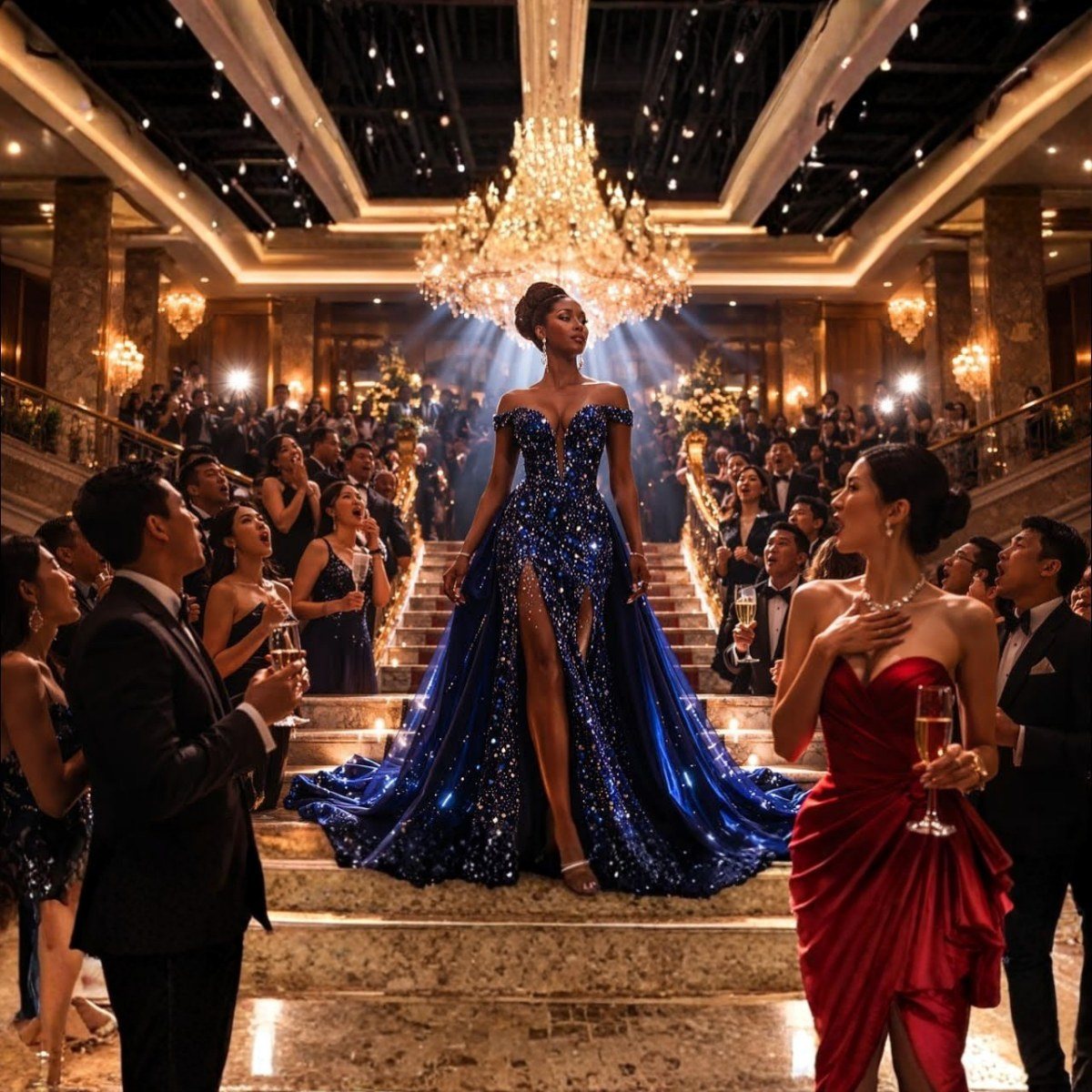Todos están conversando cuando, de repente, la atención se dirige hacia la entrada. Gabriela aparece bajando las escaleras con un vestido azul impresionante, elegante y extremadamente caro. Se ve segura, sofisticada y completamente fuera de lugar… pero en el mejor sentido.