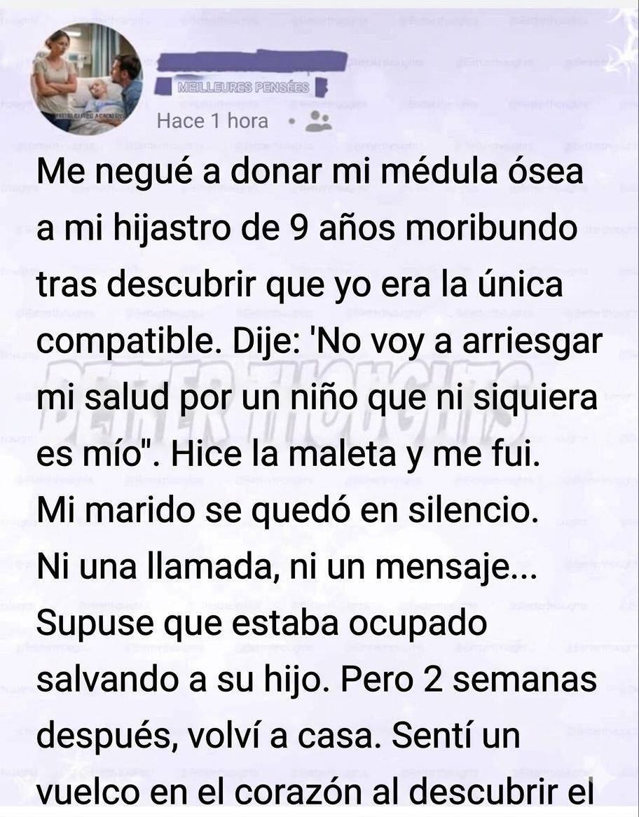 Esas palabras sonaban frías incluso para mis propios oídos, pero en ese momento me convencía de que eran lógicas. La donación de médula ósea no era algo trivial. Había riesgos, complicaciones y un período de recuperación. Me repetía que apenas conocía a ese niño cuando me casé con su padre. No había estado presente en su infancia, en sus primeros pasos ni en su primer día de escuela.