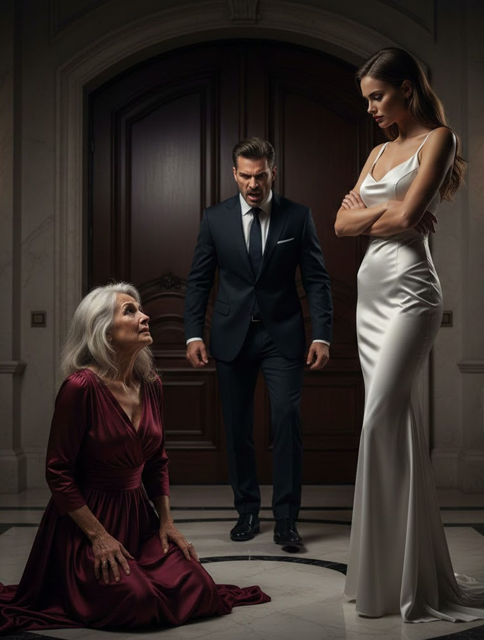La madre del millonario cayó de rodillas con el rostro lleno de miedo. “Por favor, basta”, suplicó entre lágrimas. La prometida la miró con desprecio, disfrutando del poder, creyendo que podía quebrarla frente a todos, pero no sabía que cada palabra, cada lágrima estaba siendo escuchada por alguien que no perdona. Y cuando el millonario entró, su mirada hizo temblar las paredes y a su prometida también.