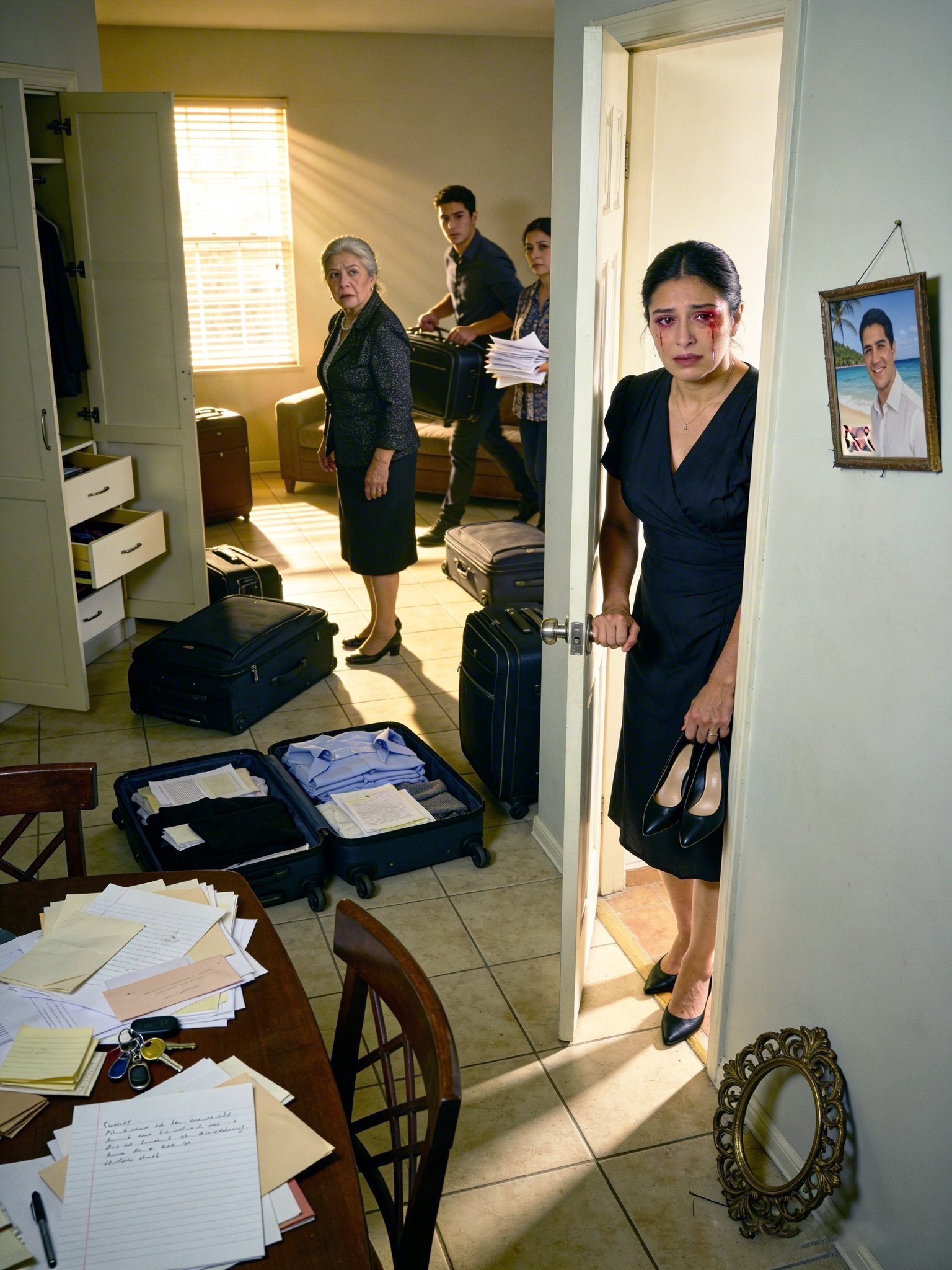 Y me encontré a mi suegra, Doña Teresa Álvarez, y a ocho familiares metiendo maletas como si fuera un hotel. Habían abierto armarios. Arrastraban perchas. Apilaban cajas en el pasillo. En la mesa del comedor había llaves, sobres y una lista escrita a pluma: “ropa”, “electrónica”, “documentos”.
