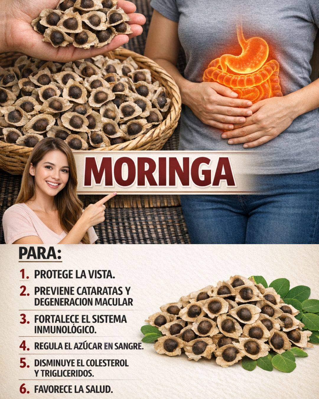 La moringa (Moringa oleifera), conocida como el “árbol milagroso”, es una de las plantas más completas y nutritivas del mundo. Sus hojas, semillas y aceite se utilizan desde la antigüedad para fortalecer el sistema inmunológico, eliminar toxinas y mejorar la salud ocular.