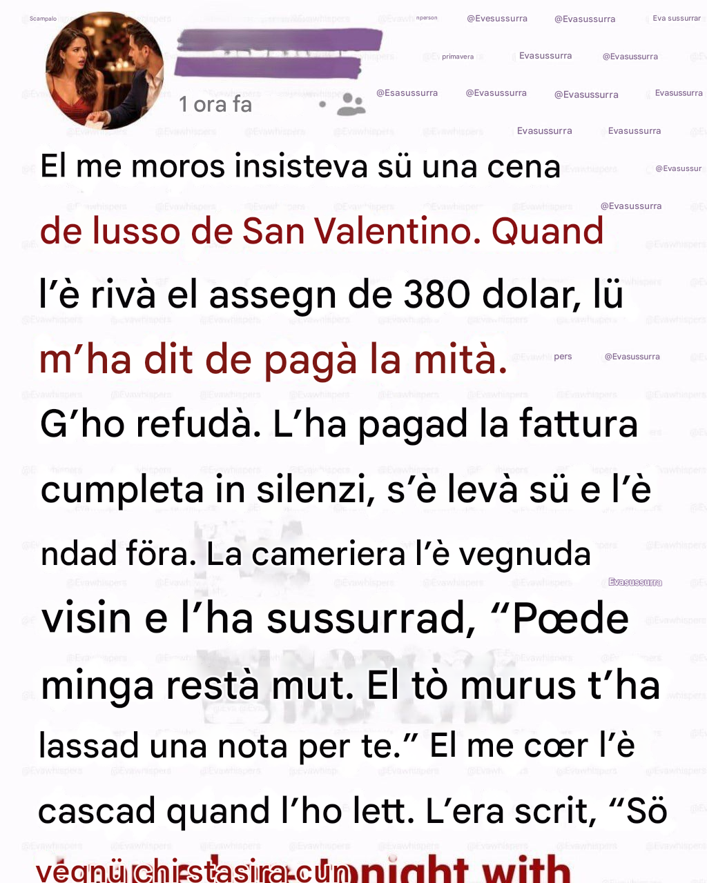 Quai volt i mument püsee rivelatur en una relaziun rivan travestid de situaziun urdinari. Per una dona, quella che duverìa vess stad la sira pusè romantica de la sò vita l’è diventada ul mument indue l’ha descuvert una verità che l’avarìa cambiad tutt.